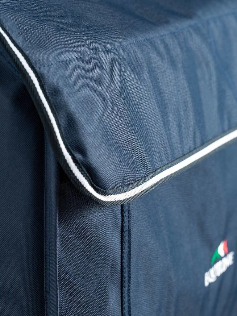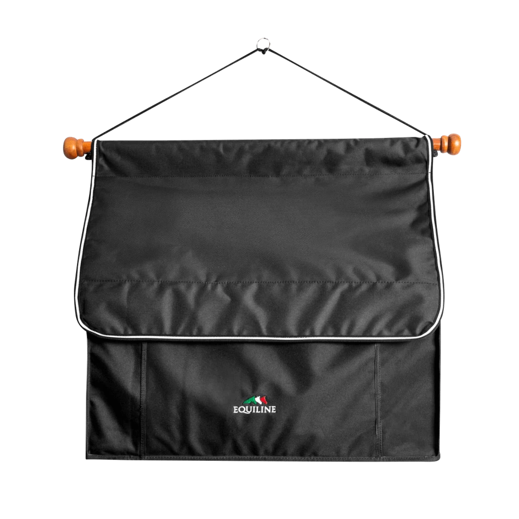 The Equiline Holder accessory bag keeps things tidy in the stable or at the show. It is made of water-repellent, synthetic material and is particularly durable and robust. Thanks to the many subdivisions, the accessories can be neatly stowed away. The bag can be opened and closed quickly and easily with a Velcro fastener. The coloured edging on the hem, the wooden stick and the logo in the middle on the front have a particularly elegant effect. This accessory bag is easily hung on a cord.