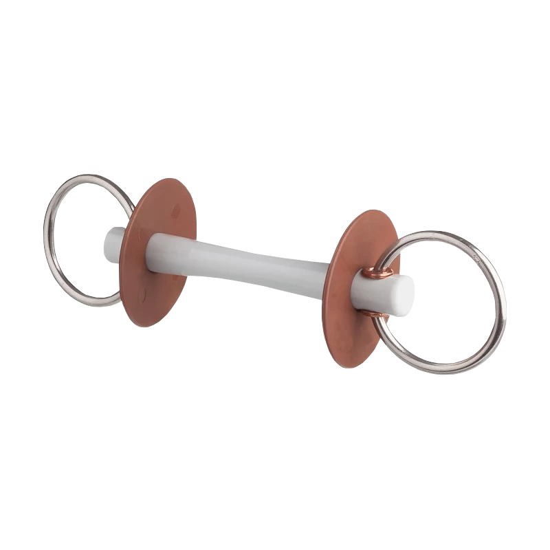 The water snaffle from Beris comes with an anatomically correctly shaped stick that adapts not only to the horse’s anatomy but also to its needs. The loose-running rings, which are variable in size, ensure greater mobility of the bit and are therefore ideal for horses that prefer a more mobile bit. The copper bushes incorporated into the bar ensure improved durability and considerably increase the life of the bit. The side discs prevent the lips from getting caught, which also protects the sensitive horse’s mouth. The classic Beris plastic convinces with its high acceptance, which stimulates chewing activity and contributes to the horse’s well-being. Due to the curved shape of the bar, the pressure is evenly distributed over the chests as well as the tongue, but gives the latter sufficient freedom of movement and scope. Due to the particularly gentle and gentle properties of the bit, it is particularly suitable for young or inexperienced horses that are to be introduced to a bar.
