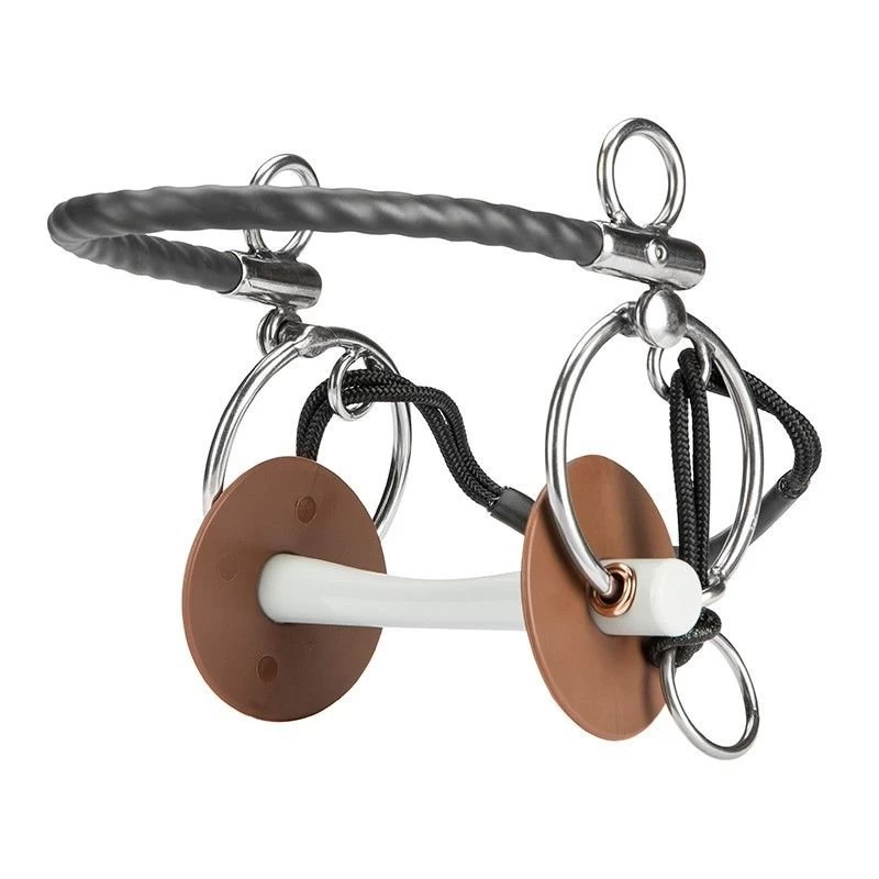 The “tango” works with two different reins, or straps, the first strap exerts increased pressure on the nasal bone and the lower jaw branches when accepted, whereas the second strap acts like a chin chain that can be activated or released for additional control. For these reasons, the “Tango” is particularly suitable for very hot horses that do not tolerate too much pressure in the mouth. The classic comfort bar made of Beris plastic is highly accepted, as it not only distributes the pressure evenly over the chests as well as the tongue, but also allows the latter sufficient space and freedom of movement. The additionally attached bit discs make it impossible to pinch the lips and thus protect the sensitive horse’s mouth. As the “Tango” has a very strong effect, its use requires an experienced and sensitive rider’s hand.