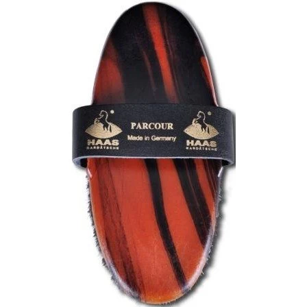 The body brush parcour by Haas has a gray and black horsehair mix. This combination of strong horsehair gives the horse brush an excellent cleaning effect. The brush also has a leather wrist strap, which is very practical.