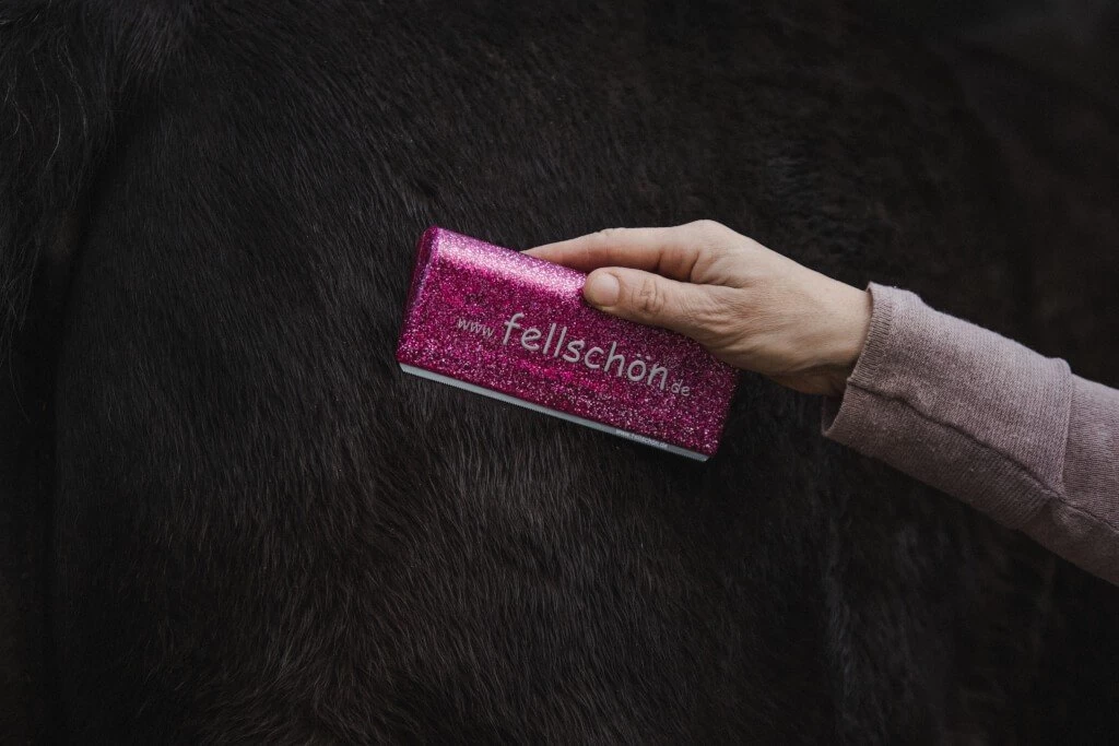 The brush from Fellschön is a useful tool for removing winter or summer fur. It is made of a wedge-shaped plastic handle with glitter and the approximately 15 cm long metal blade effectively removes the fur. The wide handle fits pleasantly in the hand and due to its width, the hair can be removed over a large area. The fur does not get stuck in the short metal tines, but falls to the ground in clumps, making it easier to clean and disinfect the brush. The metal tines are also so fine that the coat change helper is also suitable for sensitive horses. Especially the glittering surface makes the brush a real highlight for every grooming box.