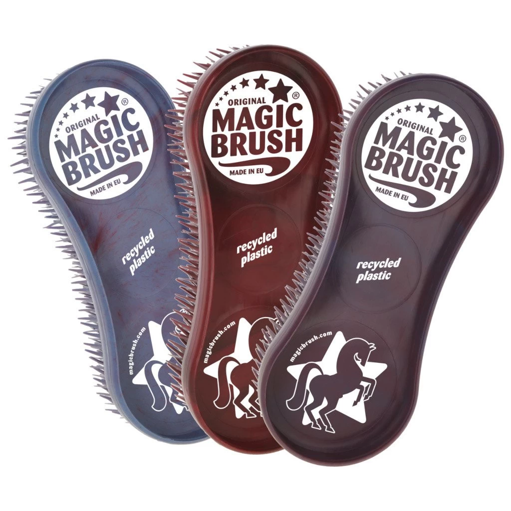 The brush set Wildberry Recycled is the environmentally friendly equivalent of the well-known standard brush set by MagicBrush. As indicated in the name, the brushes are particularly suitable for riders and groomers who want to reduce their impact on the environment with their purchase and still rely on the proven quality. They are made of recycled PE, which is the basic material obtained from used plastic products. The 3 ergonomically shaped brushes set themselves visually apart by berry colors strongly from the conventional variant and also among themselves, so that they can be easily distinguished from each other. The brushes are suitable for the care of coat, legs and hooves. Their bristles are shaped to massage the horse during grooming, while remaining gentle on joints and bones. They are still sturdy enough to even remove dirt from saddle pads and horse boots. In addition, the back of the brush can be used as a sweat scraper. For those who value hygiene, the brushes can be easily cleaned in the washing machine.