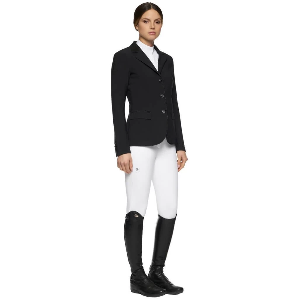 The airy GP Perforated competition jacket for women by Cavalleria Toscana impresses with its functionality. Thanks to its material composition of polyamide and elasthane is highly elastic. The special feature of this jacket is the perforated fabric, which is located on the sides, all over the back and on the sleeves. The perforation makes the jacket particularly breathable and comfortable to wear in the summer, as the air can circulate. The jacket is closed by 3 buttons on the front and 3 buttons at the end of each sleeve. Visually, the jacket impresses with its contrast piping at the opening and the pockets as well as the collar in Alcantara and the CT logo on the shoulder.