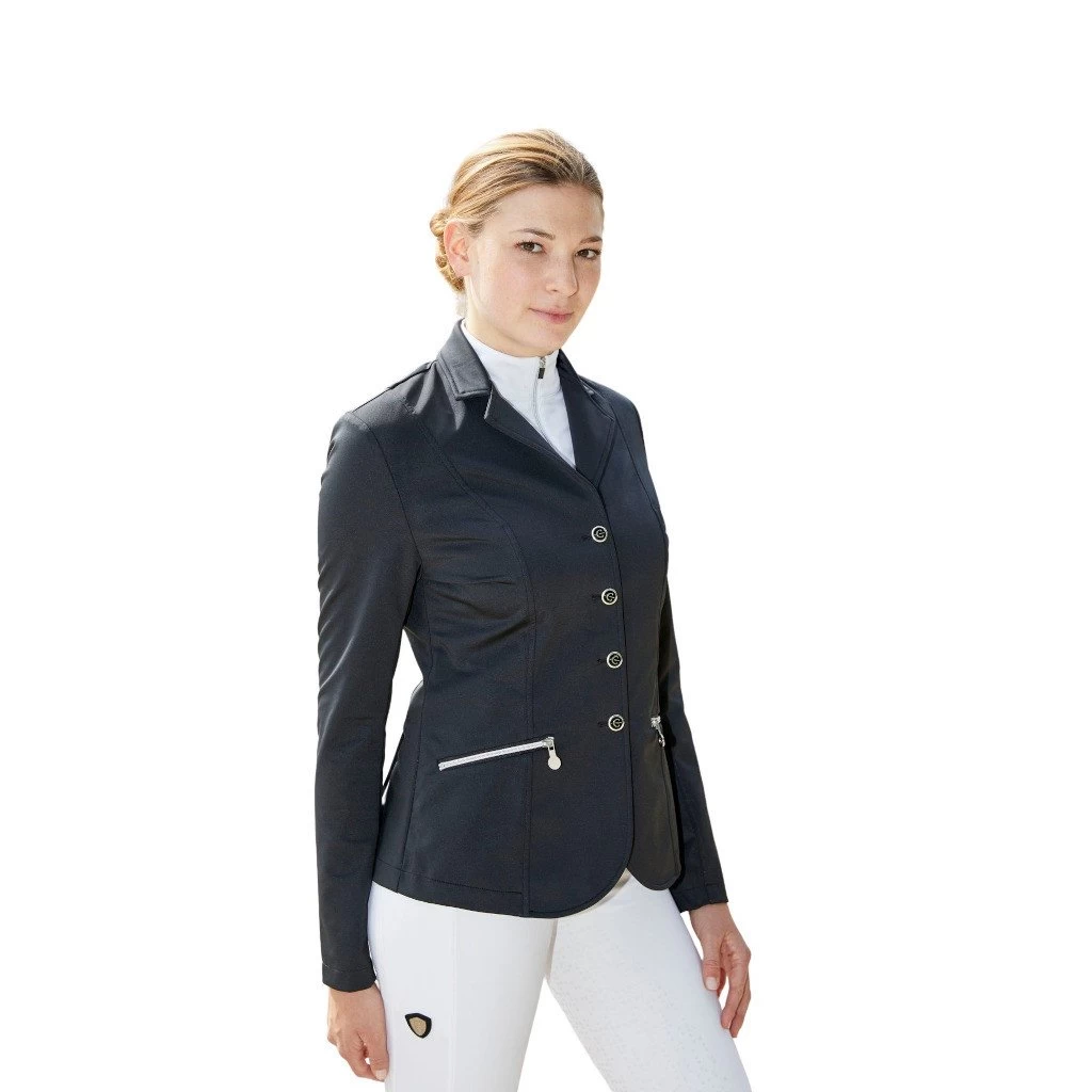 The jacket Samantha by Covalliero has a water-repellent outer material. Due to its elastic material, it offers the rider a high degree of freedom of movement, which makes it particularly comfortable to wear. Samantha has a waisted cut so it nestles particularly to the female body shape. Due to the air permeability the jacket offers additional comfort. On the front there are two outer pockets that can be closed with a zipper. On the left arm there is an elegant crest. In addition, the Covalliero logo can be found on the noble buttons. Two riding slits at the back offer the rider additional freedom of movement. The simple but elegant design makes the Samantha jacket a great companion for the perfect competition appearance.