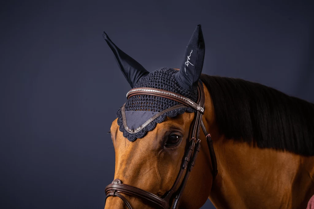 The Dyon HLA Classic fly bonnet has many functional properties. The headpiece is made of crochet yarn, while the ears are made of an elastic material that fits tightly around the ears and protects the horse from flies and other annoying insects. The material is also particularly quick-drying, so that no unpleasant moisture can form. The fly bonnet also impresses visually with its printed Dyon logo on the ear and the decorative border made of a leather strap.