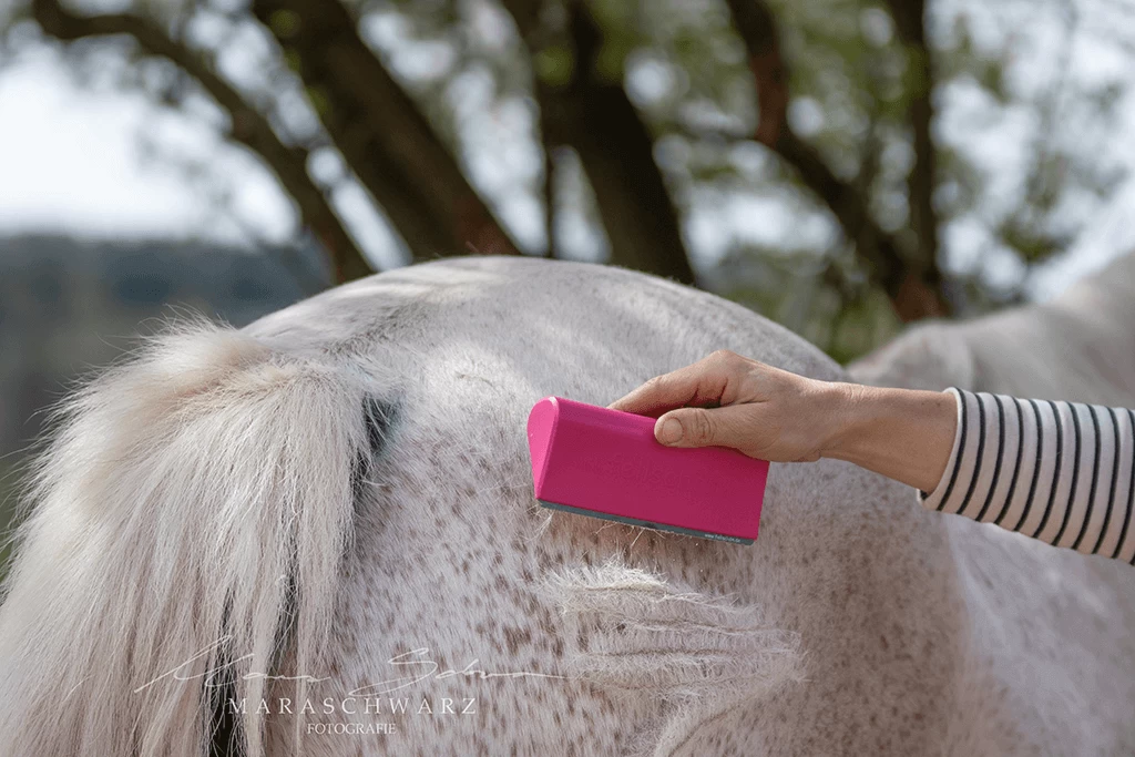 The Fellschön fur change helper is a real innovation on the horse brush market. The Fellschön brush consists of a wedge-shaped handle on plastic with an approx. 15 cm long, fine metal blade. This blade gently pulls loose hair and dander from the coat. Thus, this brush is the ideal companion during the coat change period. Due to the fine prongs, the brush is also suitable for sensitive horses. The brush is particularly wide and thus enables dehairing of larger areas. The hairs do not get stuck in the blade and fall to the ground in clumps. This makes cleaning and disinfecting the brush easier. The wide handle fits comfortably in the hand and ensures fatigue-free work. With the brush, the horse’s coat is smoothed and gets a great shine. The bright colors provide a splash of color in the grooming box and are a real eye-catcher.