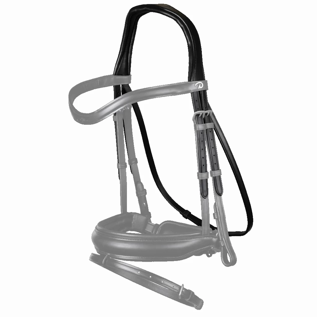 The headpiece Dressage NEC by Dyon comes from the New English Collection, which combines elegance and comfort. It is made of fine Dyon leather, which promises a pleasant feeling on the skin and does not cause any pressure points or friction due to the soft padding. A high level of wearing comfort is ensured by the anatomical cut, which leaves sufficient room for the ears and does not restrict freedom of movement. The neck piece has integrated cheek pieces that can be easily connected to the cheek straps. By means of stainless steel buckles, the straps can be adjusted in length and individually adapted to the horse’s head. The seams are color-matched and fit harmoniously into the noble overall appearance.