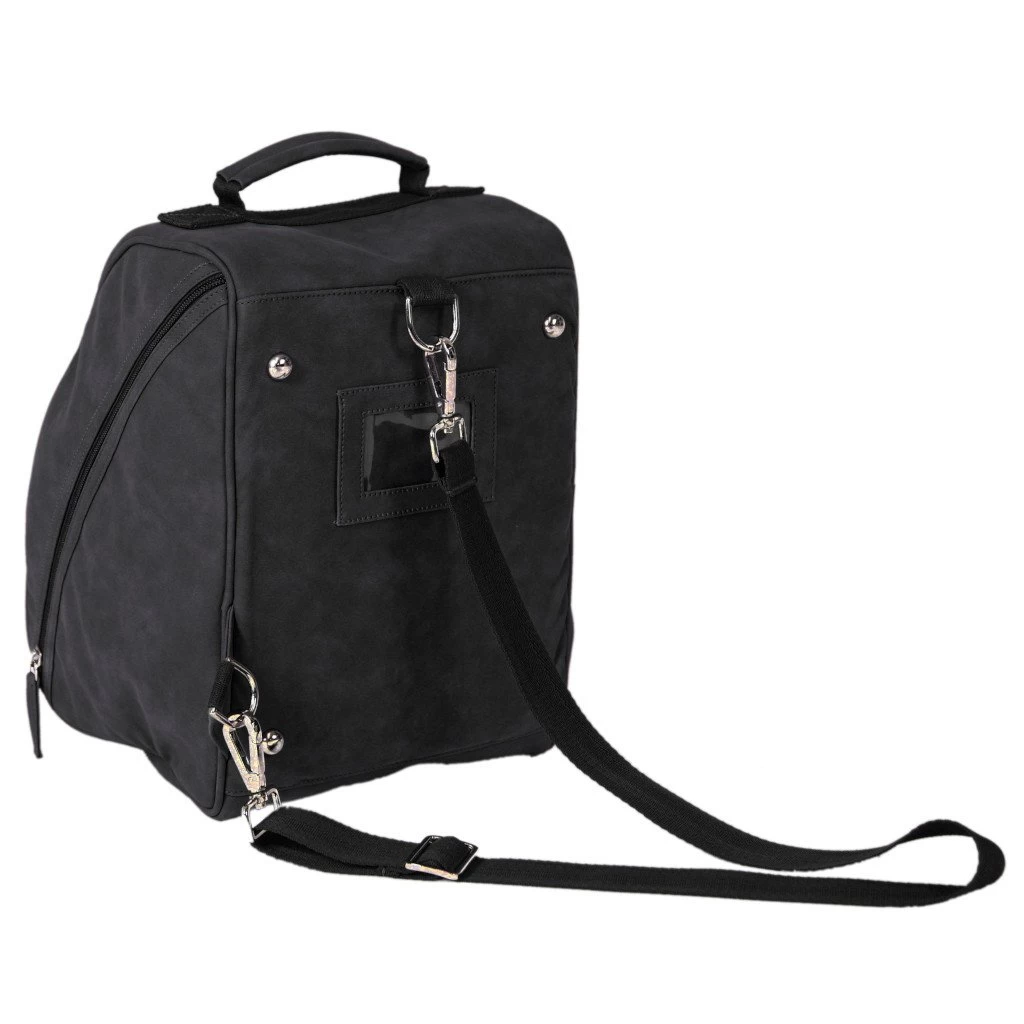 The Chestnut helmet bag from Grooming Deluxe made of synthetic leather with suede look is suitable for storing and transporting the riding helmet. The synthetic rabbit fur inside the helmet bag as well as the additional reinforcement on the back of the bag protect the helmet from external influences and have additional shock absorbing properties. The helmet bag is equipped with a large helmet pocket and two smaller pockets, which is why it offers enough storage space for additional accessories. Each individual pocket is easily accessible with the help of a zipper. For comfortable transport of the bag, it is equipped with a removable and adjustable carrying strap and a reinforced carrying handle. There is a name holder on the reinforced back of the bag.
