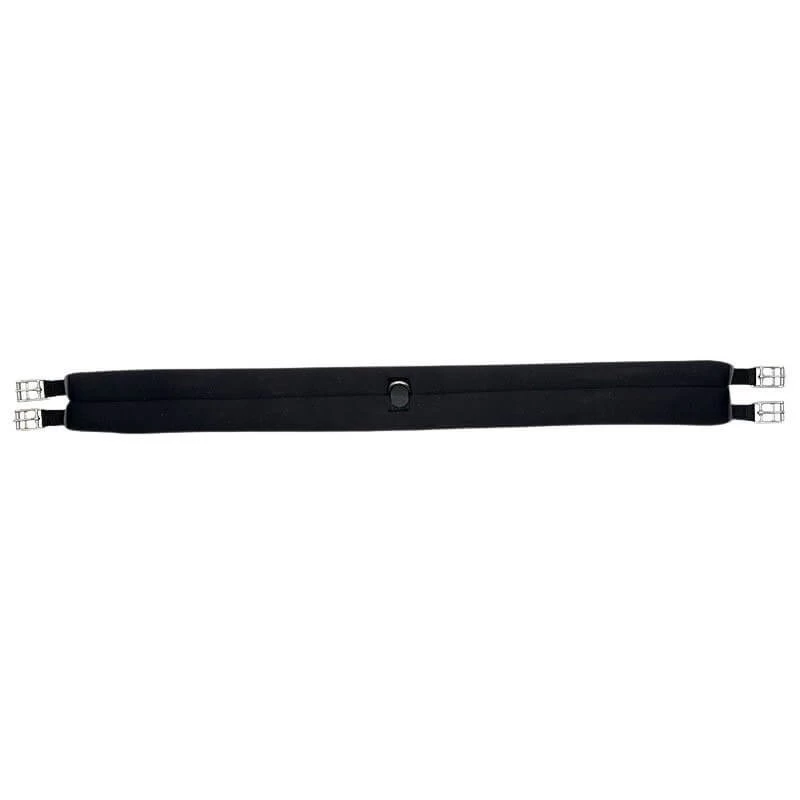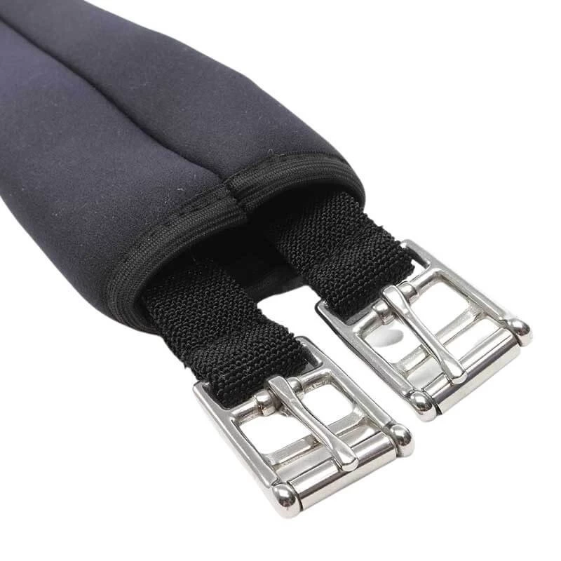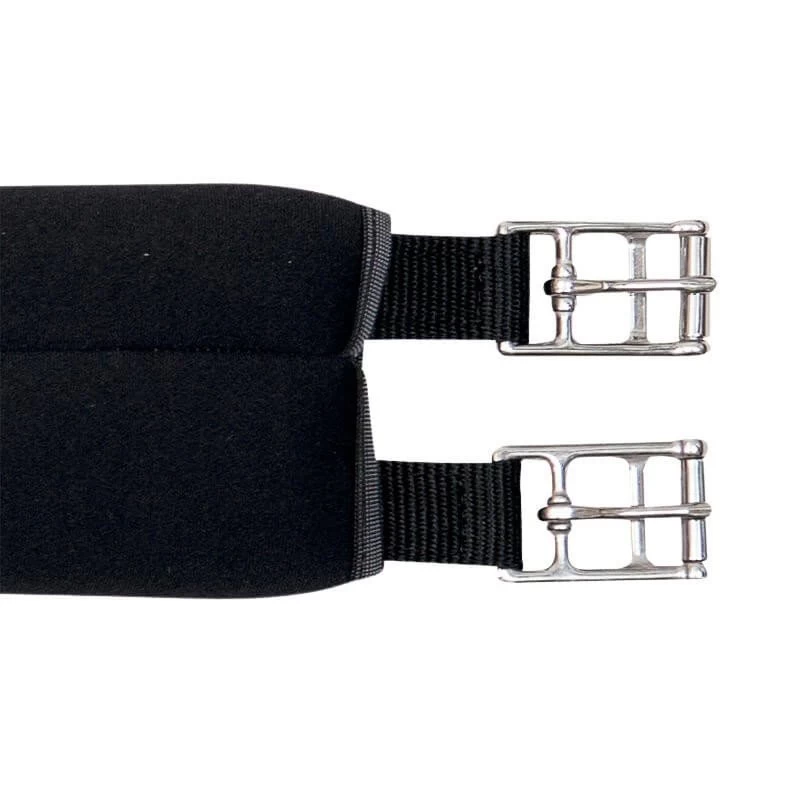 The KavalPren long girth by Kavalkade is ideal for everyday use. The material is high-quality, soft and thick neoprene, which is particularly comfortable to wear and prevents pressure and chafing. An internal nylon insert ensures the dimensional stability of the belt, so that even sweat or moisture does not affect the belt. In the middle there is a D-ring to which martingale or auxiliary reins can be attached. On the outside there are flat stainless steel roller buckles that connect the girth to the saddle. With this long girth, the horse is given enough freedom of movement while riding and also the rider has a secure and firm seat in the saddle thanks to the girth.