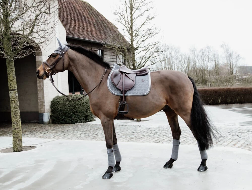 Kentucky Horsewear’s Velvet Basic saddle pad is made of soft velvet and is decorated with a double twisted cord and star quilting. This saddle pad is specially designed for show jumping, as it has a special padding between the saddle and the horse’s back. At the same time it protects against tension. The saddle pad has no loops for the saddle, but only a nylon strap for the girth itself. The logo made of imitation leather has been placed extra higher, so that the saddle pad can be embroidered with your own embroidery if necessary.
