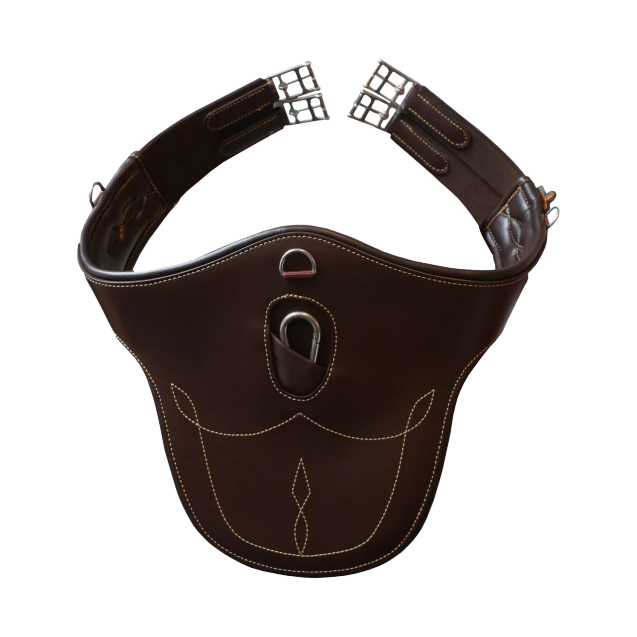 The Kentucky Horsewear stud girth is anatomically shaped for maximum freedom of movement and comfort. The outer material of the girth consists of a robust leather layer that is easy to clean. It is resistant and absorbs shocks. The buckles and D-rings are made of stainless steel, fixed with a hard-wearing material. The D-rings on the sides and in the middle can also be used to buckle training reins. In addition to the wide stud protection, the stud girth is anatomically shaped, providing comfort and security when jumping, while minimising the risk of injury from horseshoes or studs.