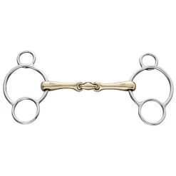 The KK Ultra Universal 3-ring bit is particularly suitable for horses that resist the aids upwards, become strong or are difficult to regulate. Thanks to the four different buckling options, there are numerous possible uses. The action of the bit can be regulated and, depending on the buckling, there is a strong or less strong leverage effect. If a chinstrap is used, the pressure on the neck is limited and additional action is exerted on the lower jaw. The mouthpiece is anatomically shaped and differs from a classical bit by the shortened middle piece, which is inclined forward by 45°. This allows for precise aiding. The center piece rolls over the central part of the tongue when the rein is picked up, activating the sense of touch without exerting pressure. The KK Ultra bits enjoy great popularity in all disciplines and training levels due to their many great features and can be used throughout, making them a real all-rounder. The mouthpiece is made of the material mix Sensogan and an alloy of copper, manganese and zinc, which oxidizes slowly and evenly and thus stimulates the chewing activity and salivation of the horse. This increases the acceptance of the bit. Sensogan is well tolerated and is therefore also suitable for sensitive horses.