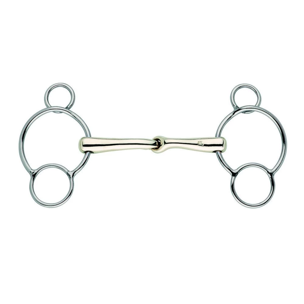 The Sprenger “KK Universal” is an anatomically shaped, adapted bit. Due to its 3 rings, the bit is versatile and can be re-buckled at any time if necessary. This allows the rider to vary the effect of the bit, as it can be used with greater or lesser leverage depending on how it is buckled. This bit is excellently suited for horses that like to withdraw upwards from the aids, become strong or for horses that are difficult to regulate in the course. This bit is also often combined with a leather chinstrap or even pelham bridle, which allows for versatile use, which is why the bit is especially popular among show jumpers. Please buckle all bits marked with an arrow so that the arrow on the left hand points forward.
