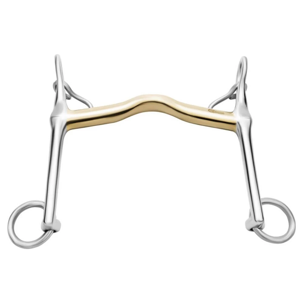 The Novocontact curb bit impresses with its forward sloping tongue clearance, which allows for an increased contact surface. This makes this curb bit the ideal bit for horses with tongue problems. The bit lies quietly in the horse’s mouth, which promotes trusting leaning. Thanks to the longer lateral tightening, the effect is slightly delayed, as the leverage distance is extended. At the same time, the pressure on the neck is increased. The mouthpiece is made of the material mix Sensogan and alloyed with copper, zinc and manganese. The alloy oxidizes and releases a sweet taste that encourages the horse to chew and increases salivation. This increases the acceptability of the bit. Due to the well-tolerated material, the bit is also suitable for sensitive horses.