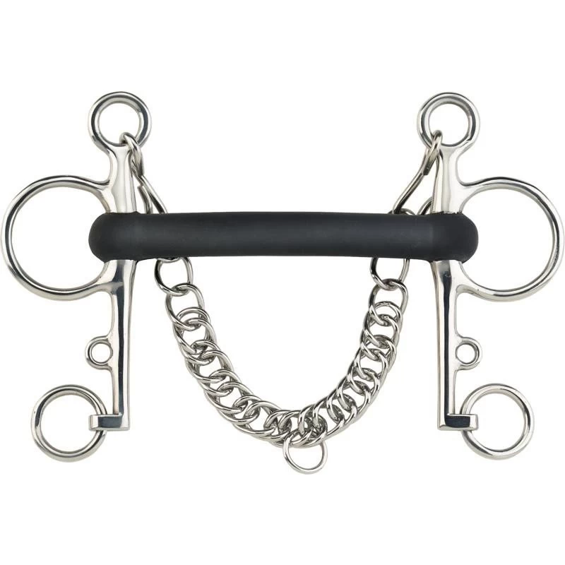 Sprenger’s rubber bits are made of stainless steel surrounded by soft rubber. Because rubber can easily cause the so-called “eraser effect”, it is important that the horses salivate sufficiently. Since the bit is very flexible and soft compared to pure metal bits, chewing and saliva flow is often stimulated, so the eraser effect is not a problem with Sprenger. Pelhams are bits that exert additional pressure on the neck by means of a lever, but often pelhams are also used with the so-called pelham straps (not included in the scope of delivery), which connect the two rings along the suits and into which only one pair of reins needs to be buckled. These different buckling possibilities make the Pelham incredibly versatile, making it ideal for show jumpers who want to change their reins more often. Since the Pelham has a somewhat stronger effect, it should only be used by an experienced and sensitive rider.