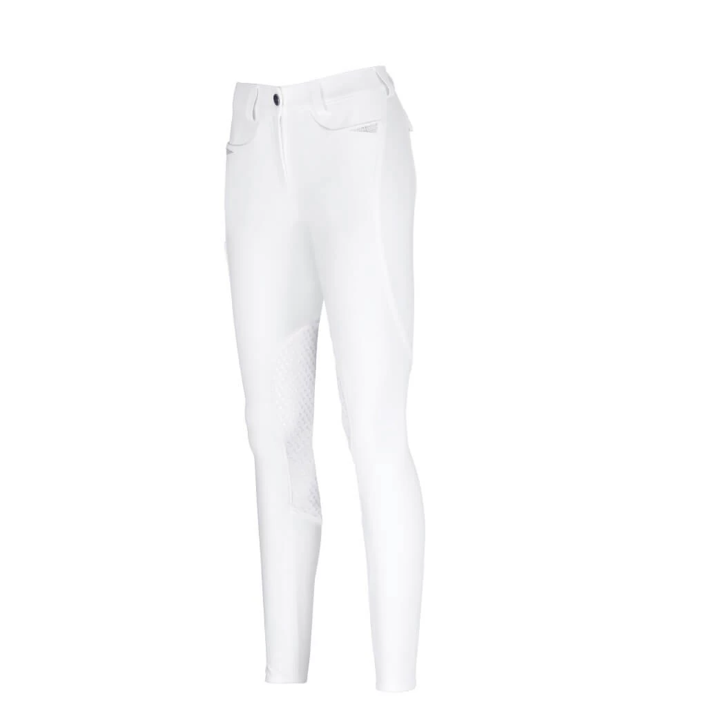 The breeches Laure is a light and soft all-season breeches, which is breathable, quick-drying and temperature regulating due to the tech jersey functional fabric. The 4-way stretch offers a pleasant wearing comfort and optimal freedom of movement. Visually, the fake flap pockets, which can be easily folded up, are an absolute eye-catcher, as they are provided with rhinestone applications. The knee grip is held in discreet snaffle bite design. In addition, the pants have two front pockets and an integrated cell phone pocket above the right knee. The pockets each have glitter details.