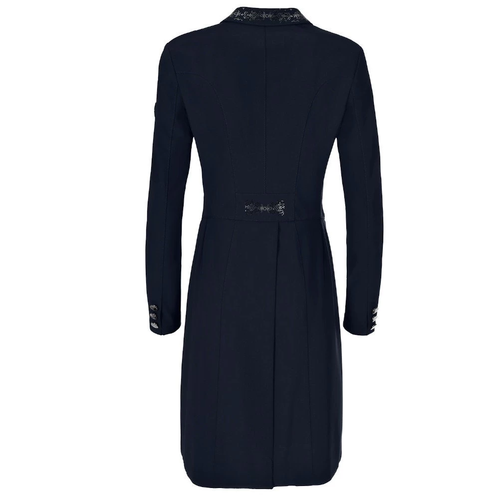 The noble women tailcoat Lilien by Pikeur convinces not only by its appearance, but also by many material properties. Through changeable corners and tuck-in cloths, you can customize the tailcoat to any riding outfit. The collar and waist belt have rhinestone appliqués, which together with the eyelet buttons on the center front and sleeves give the tailcoat a particularly classy look. A tailored cut and the use of breathable softshell fabric ensure a comfortable fit. A slim sleeve width, a wide facon and the bi-elastic and breathable fabric allow for the best possible wearing comfort. The light weight tailcoat completes every show outfit and is the ideal companion in demanding tests.