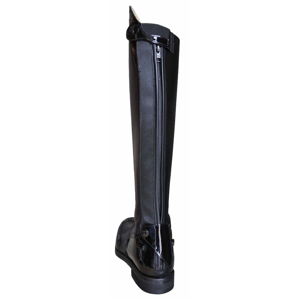 The riding boot Marilyn is an elegant and fashionable leather boot and ideally suited for tournaments and training. All Tucci boots are made with the highest quality materials and fine Italian leather. The leather is tanned using the most innovative techniques to create a material that combines genuine leather, water resistance, antibacterial materials and a 30% lighter product in the same shoe and is ecological, which guarantees more resistance and stability. The Marilyn boot has beautiful lacquer details on the toe cap, on the dressage bow and on the side of the heel. The extremely soft and fine leather inside and out offers a particularly comfortable fit. In addition, the material is breathable and offers an incredible soft-touch feeling, which improves the contact between horse and rider. An elastic back strap runs along the zipper, which is absorbent and breathable. The padded leather tongue at the back protects both the heel and the zipper and helps the foot to slip easily into the shoe of the horse boot. The antibacterial shock absorber sole absorbs unpleasant odors and offers a perfect and comfortable hold in the boot. The double seam provides more resistance along the tension points of the riding boot. The high dressage bow and the lacquer inserts complete the look of the boot perfectly. The leather and the elastic insert give in after about 1-2 weeks, so that they expand to the perfect width and they feel like a second skin. When buying, you should make sure that the riding boots are very tight. This ideal fit is particularly suitable for show jumpers, where the riding boots must not slip under any circumstances when jumping. Of course, these are also suitable for dressage, which means that the rider can have a finer effect on the horse.