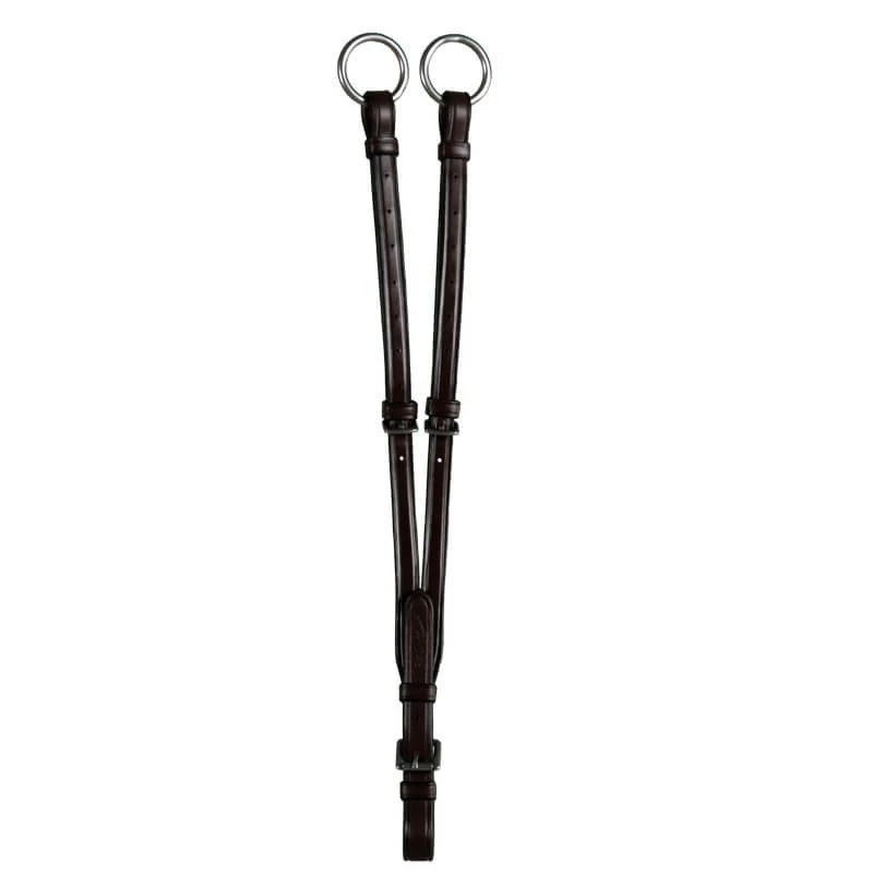 The running martingale attachment HC by Dyon is an open model. It is made of high quality Dyon leather and stainless steel rings, with the help of which it can be attached to the reins and the breastplate. To find the right length and position, holes are punched. This running martingale attachment is especially suitable for horses that take the head up strongly, beat with the head or throw themselves. The leather straps should sag when the reins are normally tightened in order to have the right effect. But not only functional, also visually the running martingale attachment convinces by the color-matched seams, which give it an elegant appearance.
