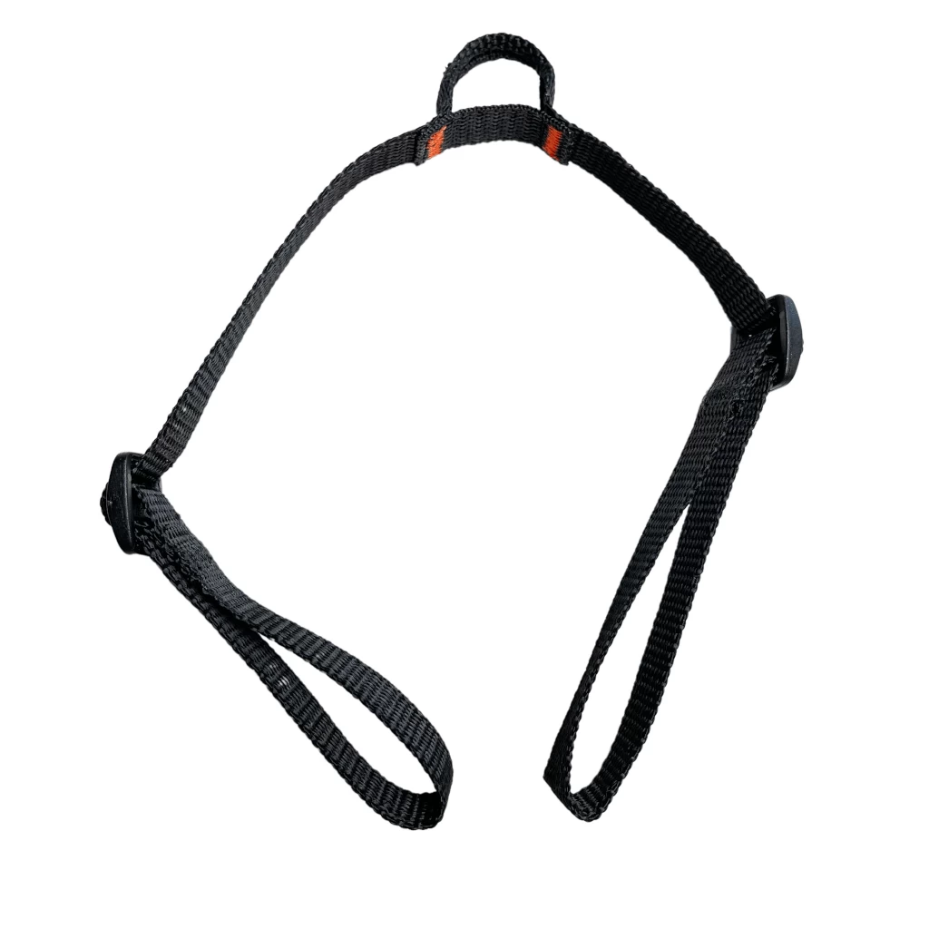 The attachment strap is made of high performance textile and can be adjusted in length. The strap is attached to the blades underneath the saddle flaps. The ripcord carabiner is then attached to the single loop of the attachment strap. The attachment must be made before each ride so that the airbag can be deployed in the event of a fall. The airbag should not be attached directly to the rings of the saddle, as they are not made to withstand the upcoming pressure when the airbag is deployed. The fastening strap is a mandatory requirement, because only then the full functionality is guaranteed.