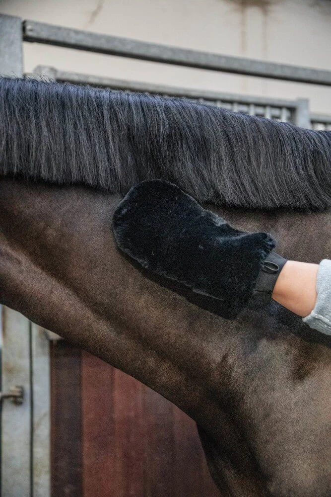The grooming glove is made of artificial sheepskin. This is ideal for picking up and holding dust from the horse’s coat. Sheepskin also has the property of distributing the natural oils of the skin in the coat, giving it the final touch before a competition, for example. As the glove is particularly soft, it can also be used on the horse’s head without any problems. Artificial sheepskin is very easy to care for, as it can easily be washed at 30 °C in the washing machine. It always keeps its shape and is very durable. The glove is covered on both sides with the artificial sheepskin and is also equipped with an elastic band on the wrist to guarantee a tight fit.