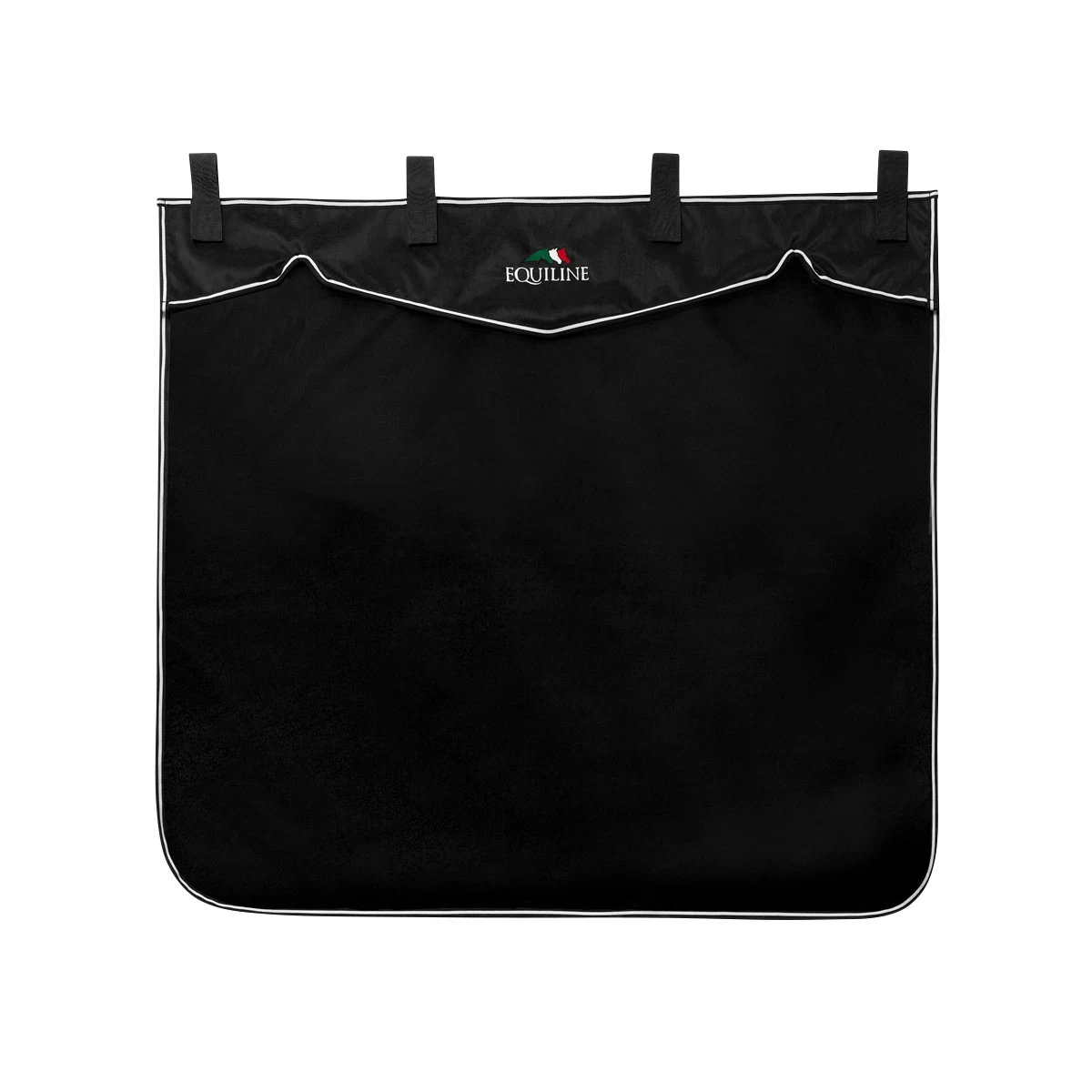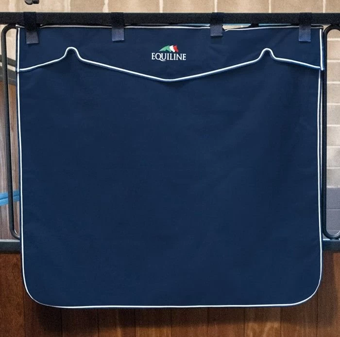 The stable curtain Shortwave by Equiline is made of water-repellent, synthetic materials. It is easy to transport and particularly easy to care for. The Velcro fasteners allow this stall curtain to be attached quickly and easily. Visually, the stall curtain convinces with the chic logo and the colour-contrasting stripe, which can be seen all around the edges. The size of the pit wall curtain is 120 cm x 130 cm.