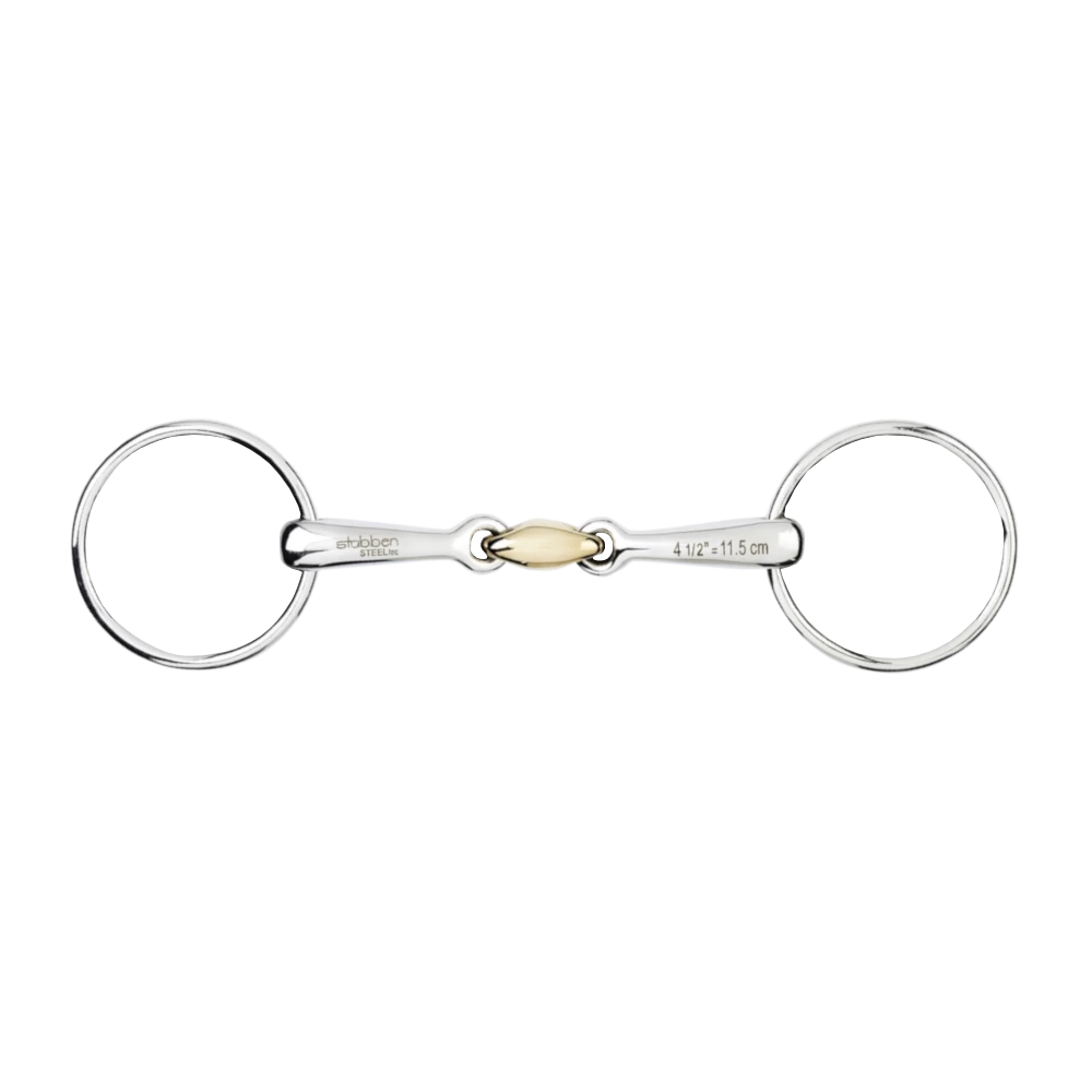 The Stübben Steeltec underlay bridle comes with a double-broken stainless steel mouthpiece, whereby the middle piece is made of the classic “sweet copper” material. This special copper compound is said to have a sweet taste for horses and therefore stimulates the chewing activity as well as the saliva flow. The increased chewing contributes to the well-being and increased permeability, which optimizes the interaction between horse and rider. Water snaffles are real all-round bits, because they are used with pleasure regardless of age, level of training or breed. Due to the reduced strength, this bit can be used as a underlay bridle, as it leaves enough space for the second curb bit, but pony riders also benefit from the reduced strength and the small bit rings. For ponies this bit can also be used as a normal water snaffle.