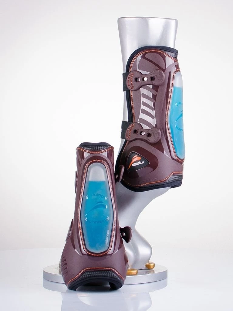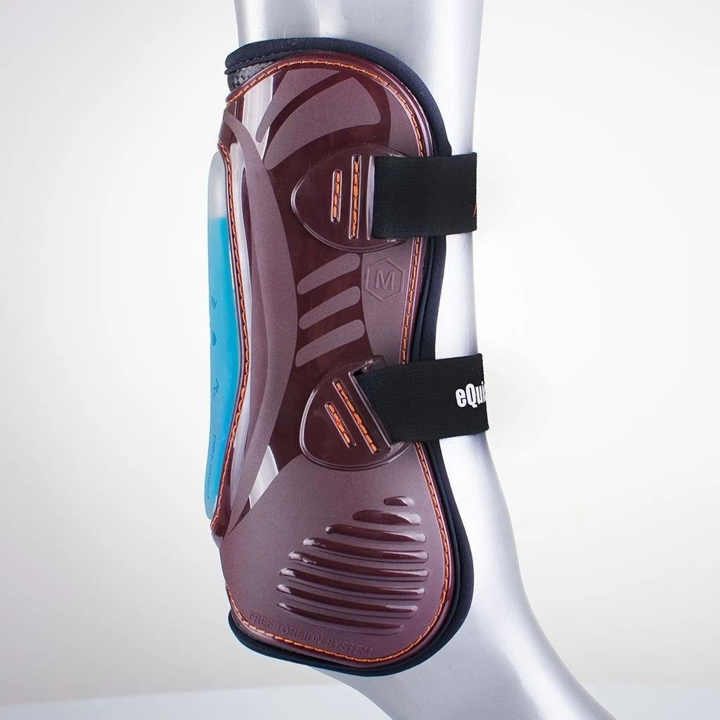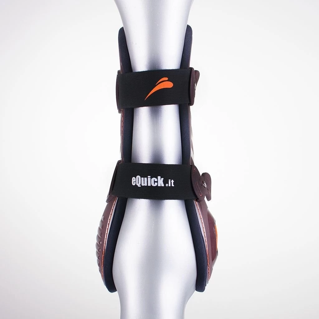 The tendon boots eShock by eQuick are a tendon boots made of high quality materials that are reliable and durable. The tendon boots are anatomically shaped to perfectly fit the leg, protecting it from injury while providing high comfort. The outer material is reinforced with TPU. The inside is lined with soft neoprene. The washable Lycra edges effectively prevent pressure points. Two attachment points and an elastic strap guarantee easy donning, as well as a firm hold. An exclusive, patented eFluidgel technology efficiently reduces the stress on the horse’s leg that could be caused by shocks and impacts through air and gel compression. The free torsion system ensures that the horse’s leg is not blocked or restricted when jumping.