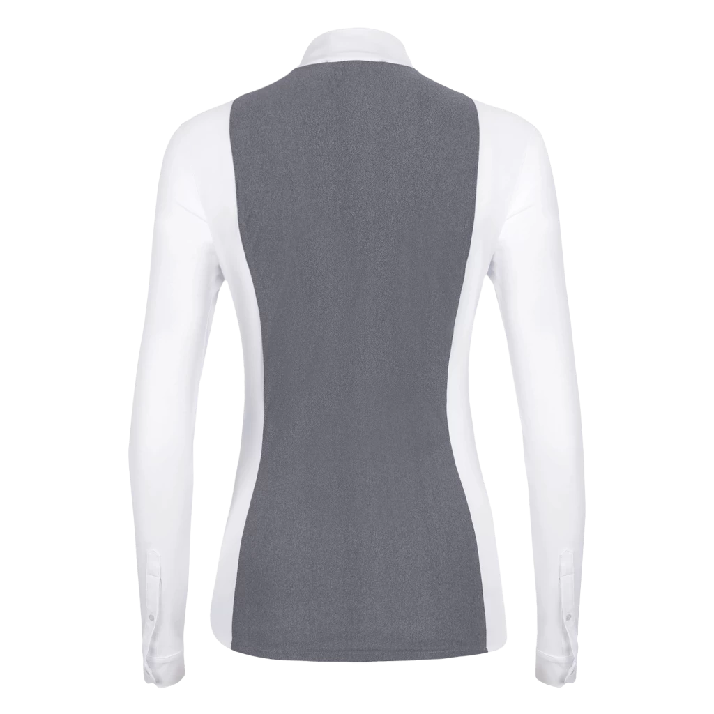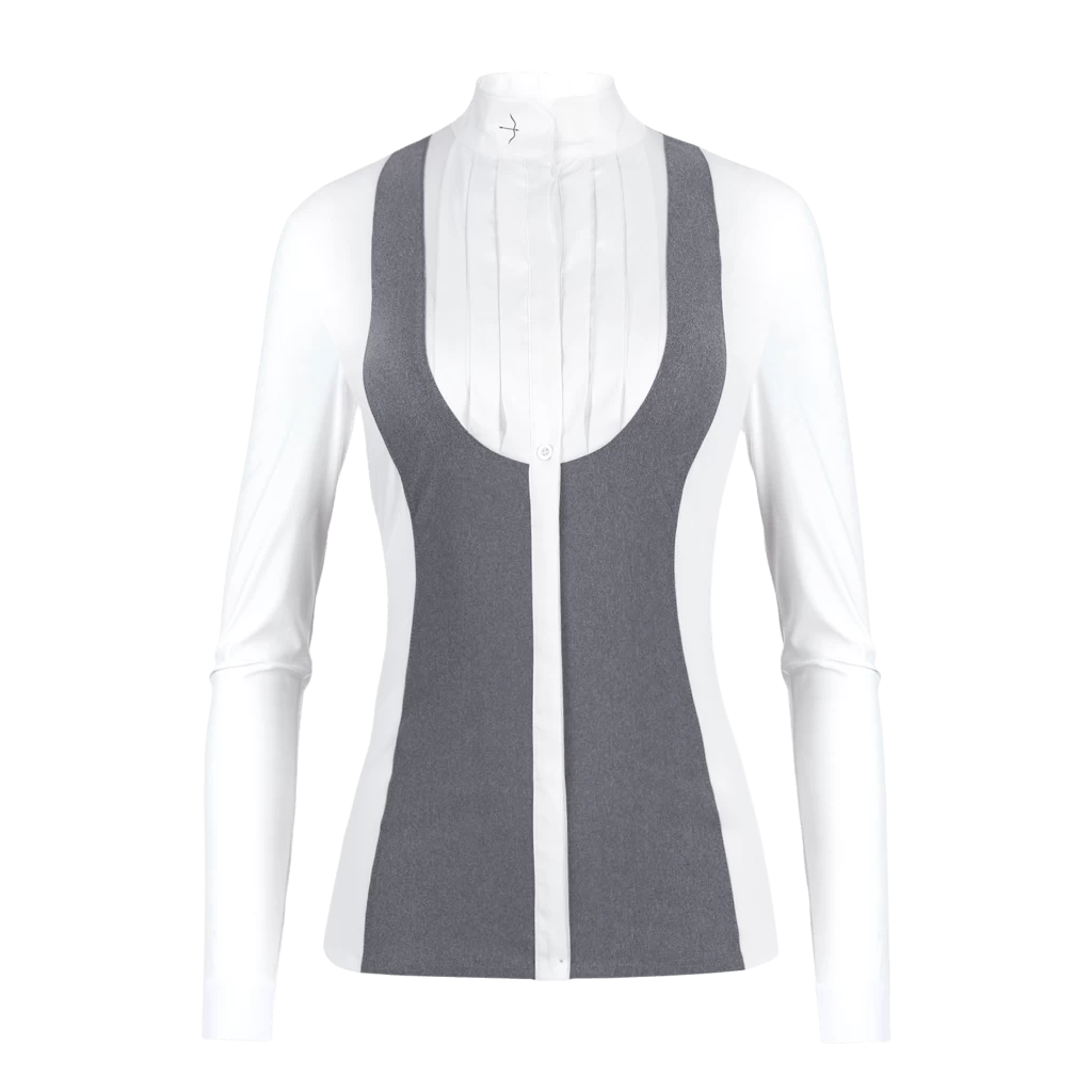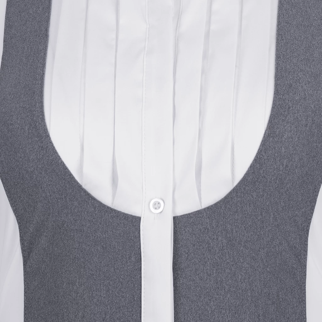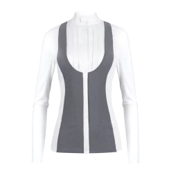 The show blouse Laila by the Laguso fall/winter collection 2021 convinces with many functional features and a sporty-elegant look. The ultra-light material is breathable, quick-drying and also has a sun protection factor 50, so that the blouse can be worn even on sunny, warm days without any problems. A real eye-catcher is the tuxedo pleated insert and the color-contrasting areas. The logo is embroidered on the small stand-up collar and the continuous, concealed button placket makes it easy to put on and take off. The bi-elastic material goes with every movement and does not restrict the rider in any of his movements. Thanks to the elastic, lightweight materials, this blouse has a very high wearing comfort and is ideal for the equestrian sports.