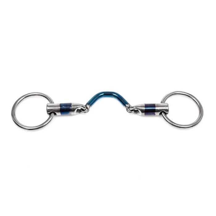 This Trust loose ring bit Wideport Segundo is a special double-broken model because it has a free tongue, i.e. the middle section has a curvature. Thanks to the curvature, the pressure on the middle of the tongue is reduced, but it is distributed over the interdental space. It should be noted that there are sharper corners on the tongue relief, which creates extra pressure points. Since this mouthpiece can move loosely in the mouth, there is a certain lateral flexibility, making it difficult for the horse to lie on the bit. The Sweet Iron alloy, which reacts with moisture and forms a sweet-tasting surface rust for horses, ensures high acceptance of the mouthpiece. The side piece consists of free-moving rings, which are considerably smaller than on a normal loose ring bit, which means that the rein aids are transmitted more directly.