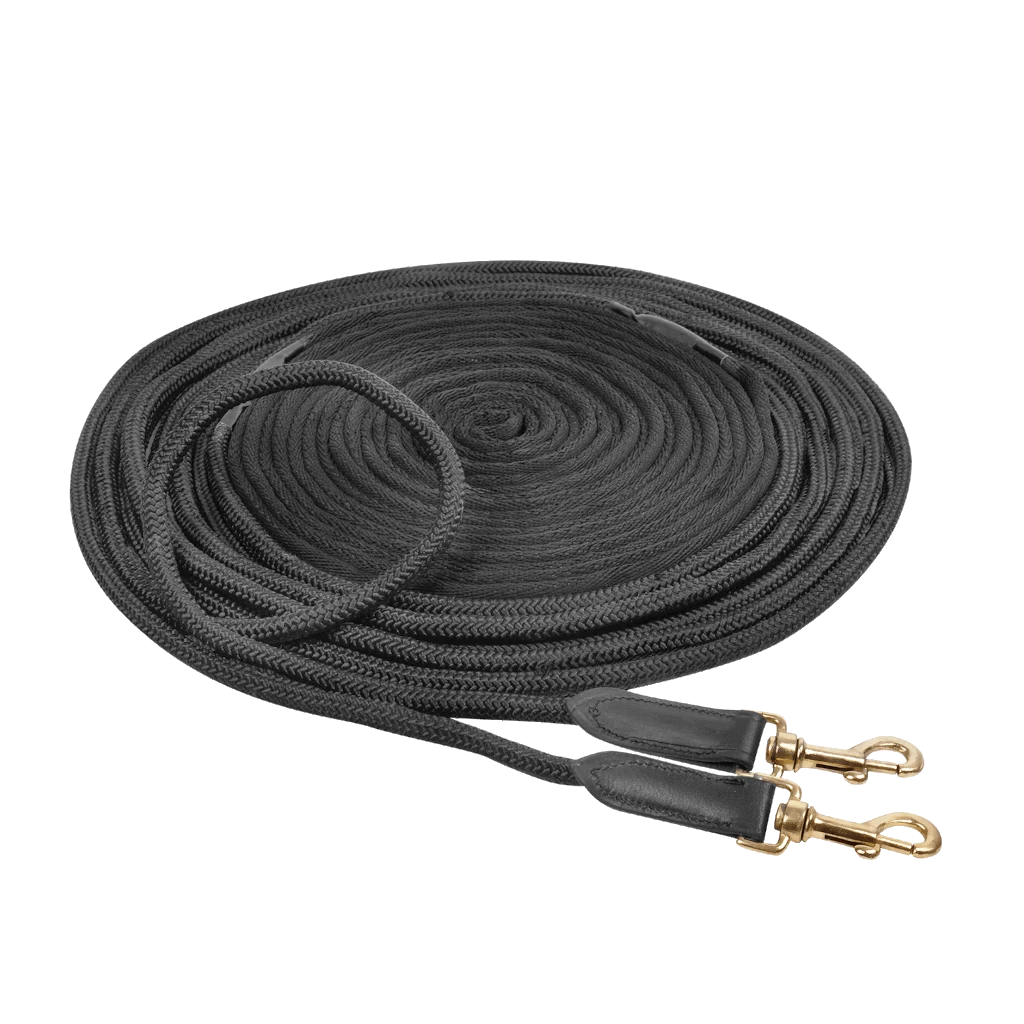 The double lunge from Waldhausen is made of synthetic materials and is particularly robust. The front section is made of round braided nylon, which runs particularly easily through the pulley. The lunge is equipped with swivel snap hooks, which are fastened with a leather reinforcement. The rear part of the lunge is made of a flat woven band, which is particularly soft and comfortable to hold. The double lunge offers a very wide range of uses, from training to correcting riding and driving horses. In addition, the horses can be worked and trained very effectively without the rider’s weight.