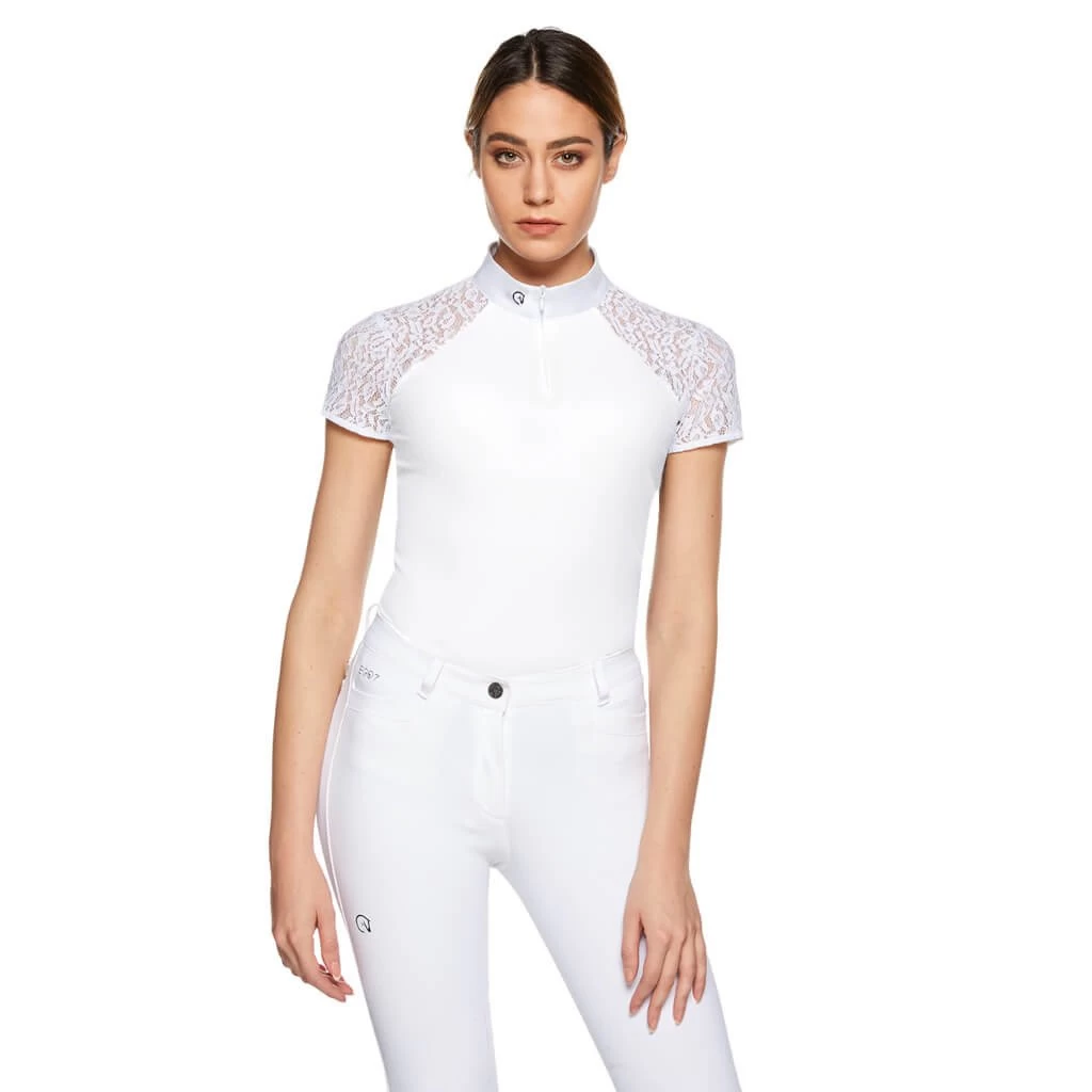 The competition shirt Florentine for women by Ego7 convinces with its elegant design. The comfortable fabric is close-fitting and emphasizes the female figure. Thanks to the elastic portion, it offers ideal freedom of movement. Since the fabric is breathable, the resulting moisture is absorbed to the outside. This lightweight shirt with UV protection is therefore ideal for competitions even on warm summer days. The zipper is hidden and the Ego7 logo is on the collar. The lace sleeves make this shirt especially comfortable to wear and provide good air circulation. This shirt combines elegance with sporty functionality, making it an eye-catcher at every competition.