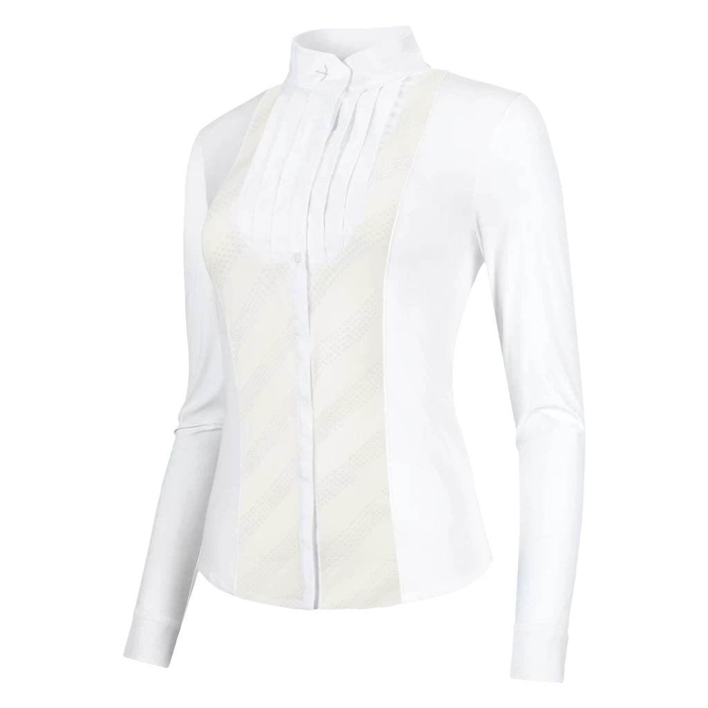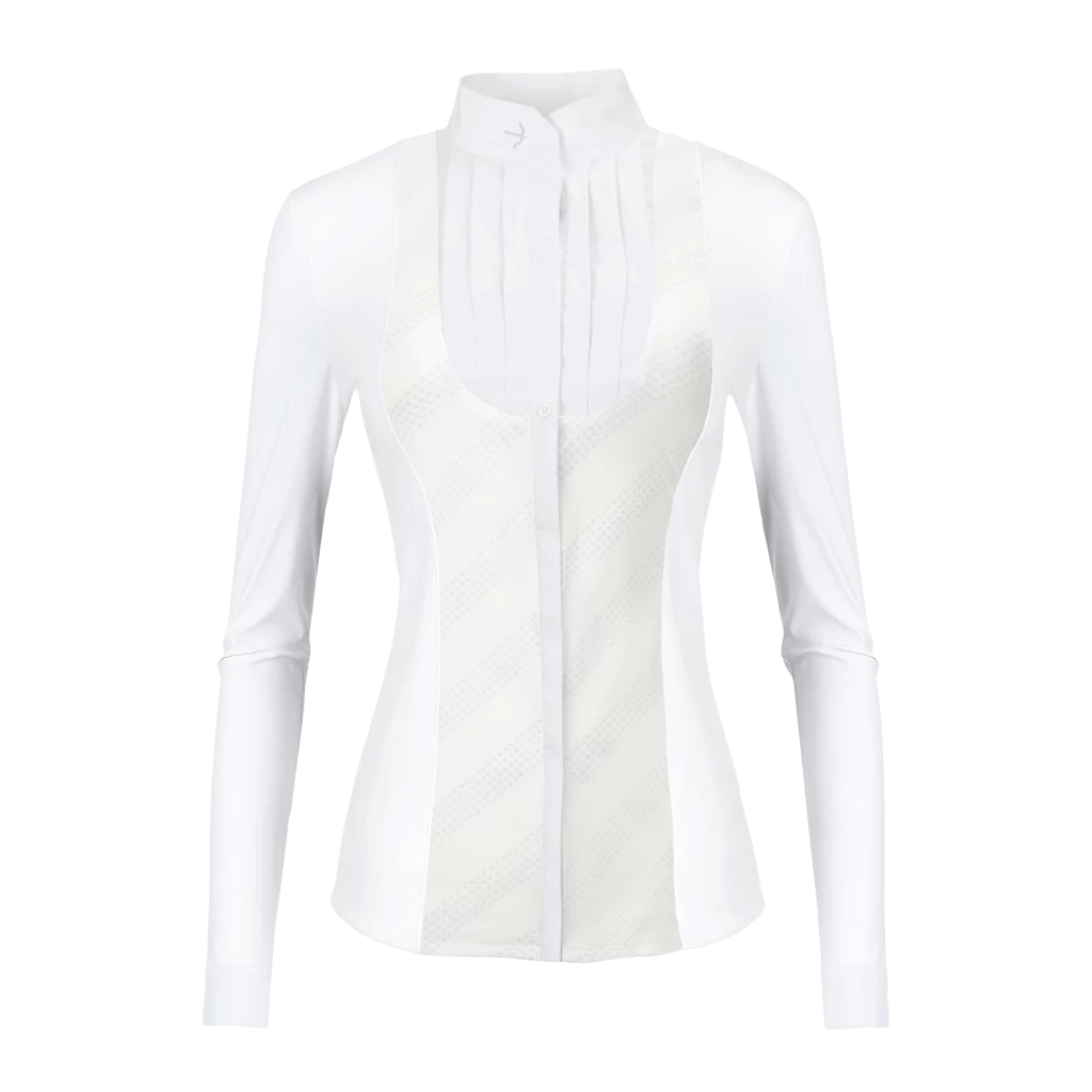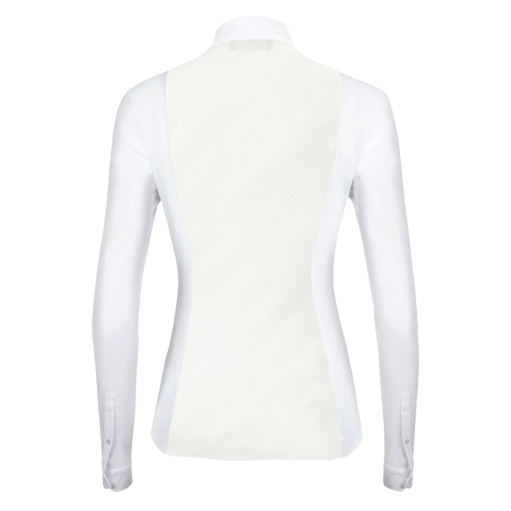 The competition shirt Laila Geo comes from the spring/summer collection 2022 by Laguso. The long-sleeved blouse is made of bi-elastic material and therefore offers optimal freedom of movement. The material is ultra-light and breathable, so that moisture is absorbed to the outside. In addition, it is quick-drying and offers with the sun protection factor 50 optimal protection on long competition days. The easy to care for shirt is lint-free. The collar area is cut to make the blouse sit comfortably and for a good fit it is cut waisted.