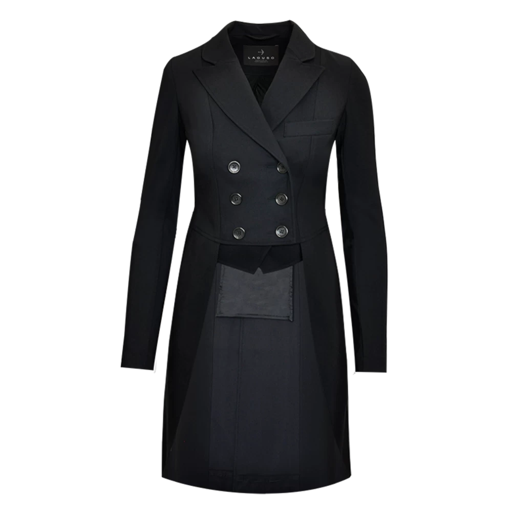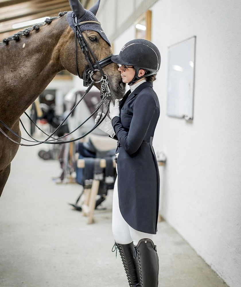 This beautiful and elegant ladies’ tuxedo is made of a breathable material, which means that moisture is absorbed away from the body, ensuring extra comfort. The use of the best materials guarantees the SPF 50 and the best freedom of movement with an optimal fit. The weight of the shocks can be adjusted individually, which makes the tails very comfortable to wear. The tailcoat becomes especially noble by the decorative button with Laguso ornament. The easy-care and lint-free tailcoat is an absolute eye-catcher, enhances every riding outfit and should not be missing in your wardrobe.